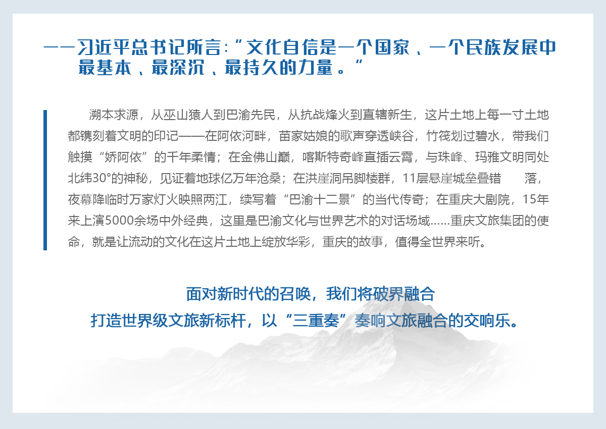 重庆文化旅游集团有限公司于2024年11月12日正式成立,注册资本12.14亿元。集团定位为现代文旅产业综合运营服务商,以深入推动文旅融合、繁荣发展新时代重庆文化事业、文化产业和旅游业为主责,聚焦“文旅资源开发运营”和“现代文旅综合服务”两大核心主业,围绕千军万马做文旅,集结头部做文旅,市区一体做文旅,数智驱动做文旅,串珠成链做文旅,百业融合做文旅,焕新增彩做文旅,一颗“文心”做文旅八大发展理念,以巴蜀文化旅游走廊建设为牵引,深化“文旅+”产业生态构建,强化数字化赋能与全方位营销,做深融合、做优资源、做强产业、做响品牌、做活运营、做精服务,打造“世界山水都市”“壮美长江三峡”“多彩风情武陵”等标识性文旅IP,创建一流现代文旅产业领军企业,引领带动全市文旅产业发展,推动重庆文化旅游强市和世界知名文化旅游目的地、全国文化旅游高质量发展示范地、西部地区文化旅游融合发展引领地建设,形成更多“西部领先、全国进位和重庆辨识度”标志性成果。集团现阶段重点推进景区运营、酒店运营、游轮旅游、智游服务、旅行服务、数字文旅、策划创意、宣传营销、会展业务、文化金融、文化演艺、地产建设12大文旅业务板块。