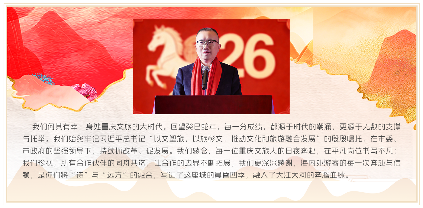 依托重庆文旅宣传口号“雄奇山水 新韵重庆”,重庆文旅集团倾力打造的美好“年”走廊新春文旅IP,既是集团改革成效的集中展现,也是践行五大发展战略、“十做文旅”发展理念的重要载体。该活动始终以“迎”“陪”“送”为服务宗旨,串联集团全业态,2026年推出年味地图、徒步线路等特色内容,融合民俗体验、明星互动等多元环节,打造沉浸式新春文旅场景,彰显重庆文旅独特魅力,助力提升“重庆文旅”品牌的影响力、带动力与国际范,实现品牌价值与客流效益的双重提升。