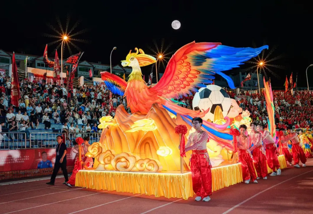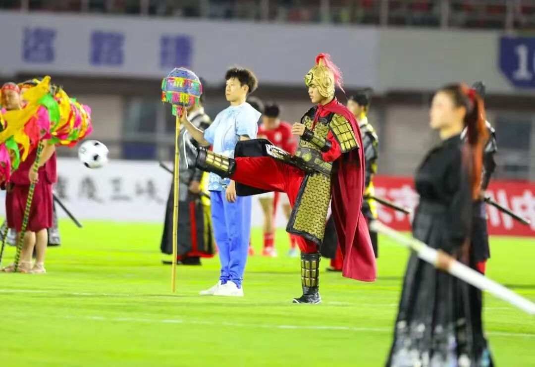 丰都,《主题花车》《龙凤神鸟》《神鼓面具》《十大阴帅》等多支开场舞接连登场,用极具地域特色的表演点燃全场热情。当神鼓敲响,流光亮起,绿茵场上,演员们舞姿翩翩,化身为丰都千年文化长河的一朵浪花,如梦如幻。
